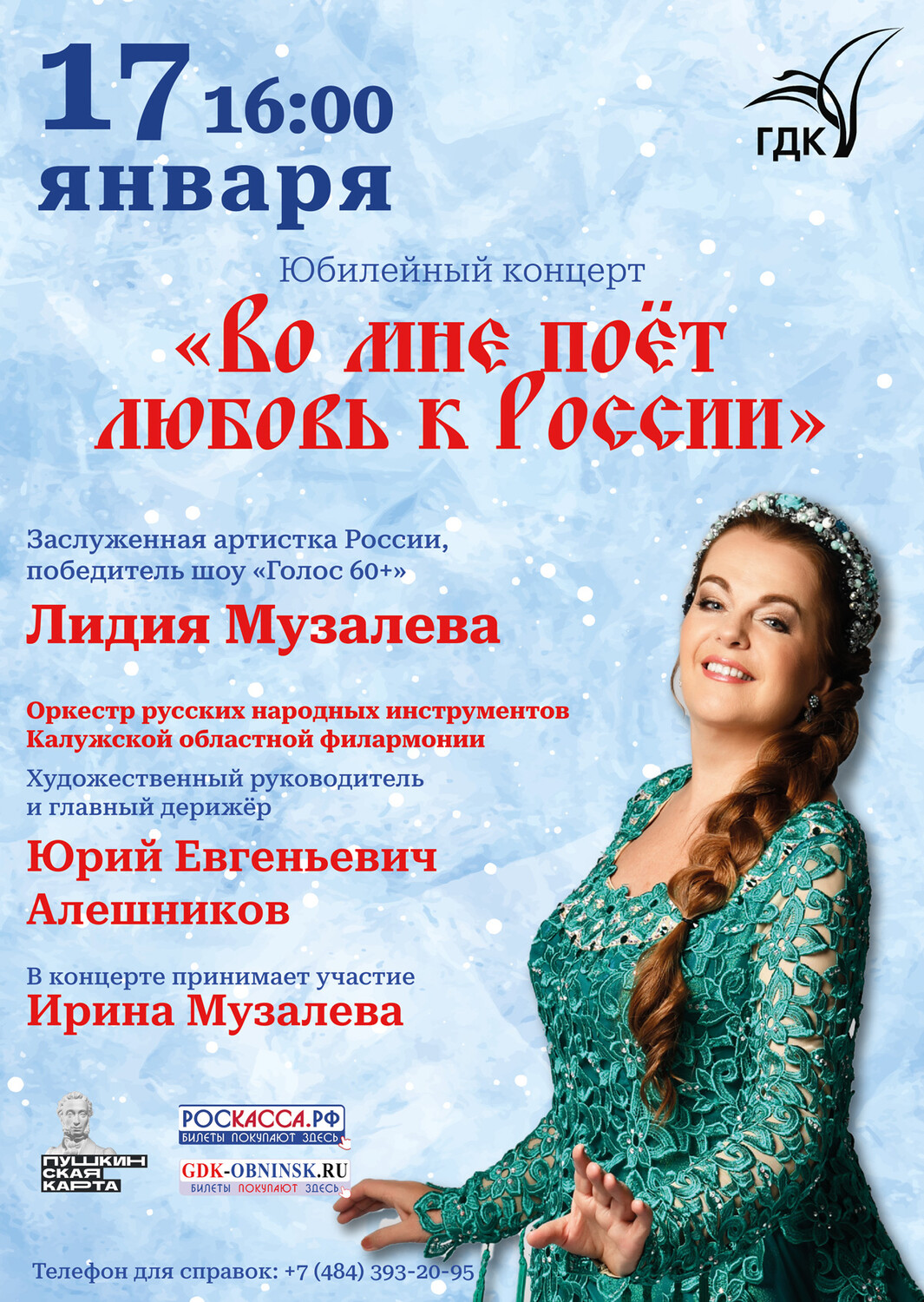 17 января в 16 часов в Городском Дворце Культуры состоится концерт одной из самых ярких исполнительниц народной музыки заслуженной артистки России Лидии Музалёвой в сопровождении оркестра русских народных инструментов им. Е. Тришина, художественный руководитель и главный дирижёр Юрий Алешников.