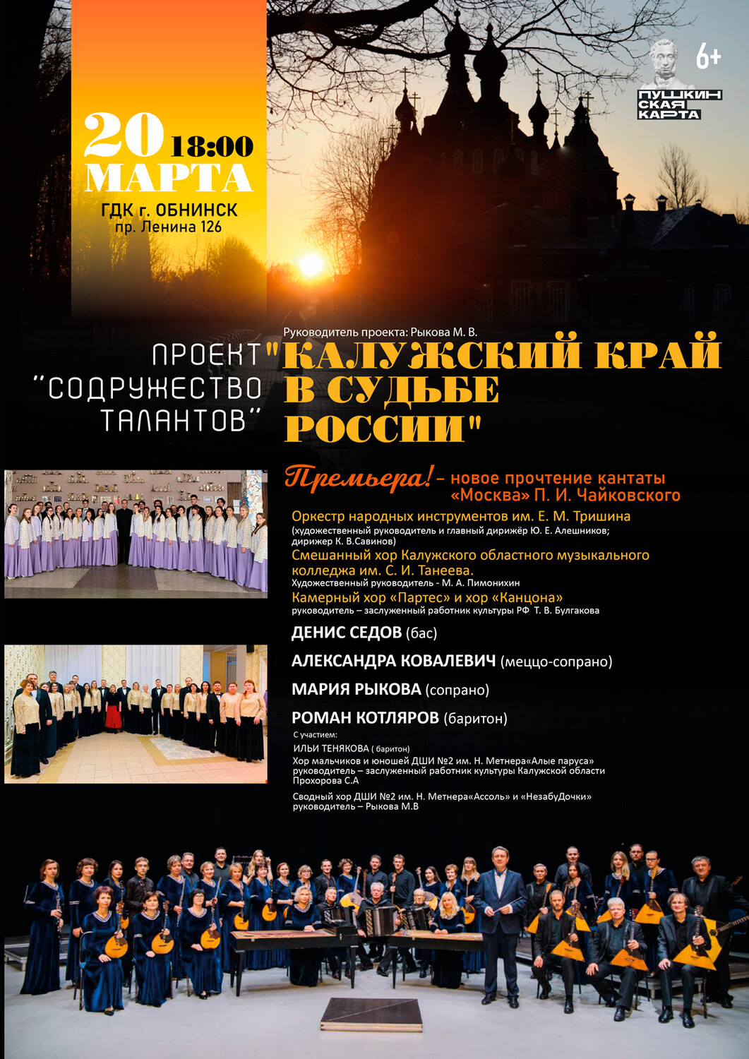 20 марта 2026 года в 18:00 на сцене ГДК г. Обнинска в рамках просветительского проекта «Содружество талантов» (руководитель – Мария Рыкова) пройдёт концерт под названием «Калужский край в судьбе России». Это не просто концерт, это настоящее погружение в богатейшее наследие Калужской земли, её славное прошлое, её уникальное искусство и, конечно же, её героические страницы.