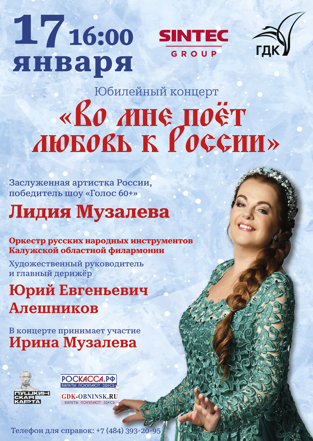 17 января в 16 часов в Городском Дворце Культуры состоится концерт одной из самых ярких исполнительниц народной музыки заслуженной артистки России Лидии Музалёвой в сопровождении оркестра русских народных инструментов им. Е. Тришина, художественный руководитель и главный дирижёр Юрий Алешников.