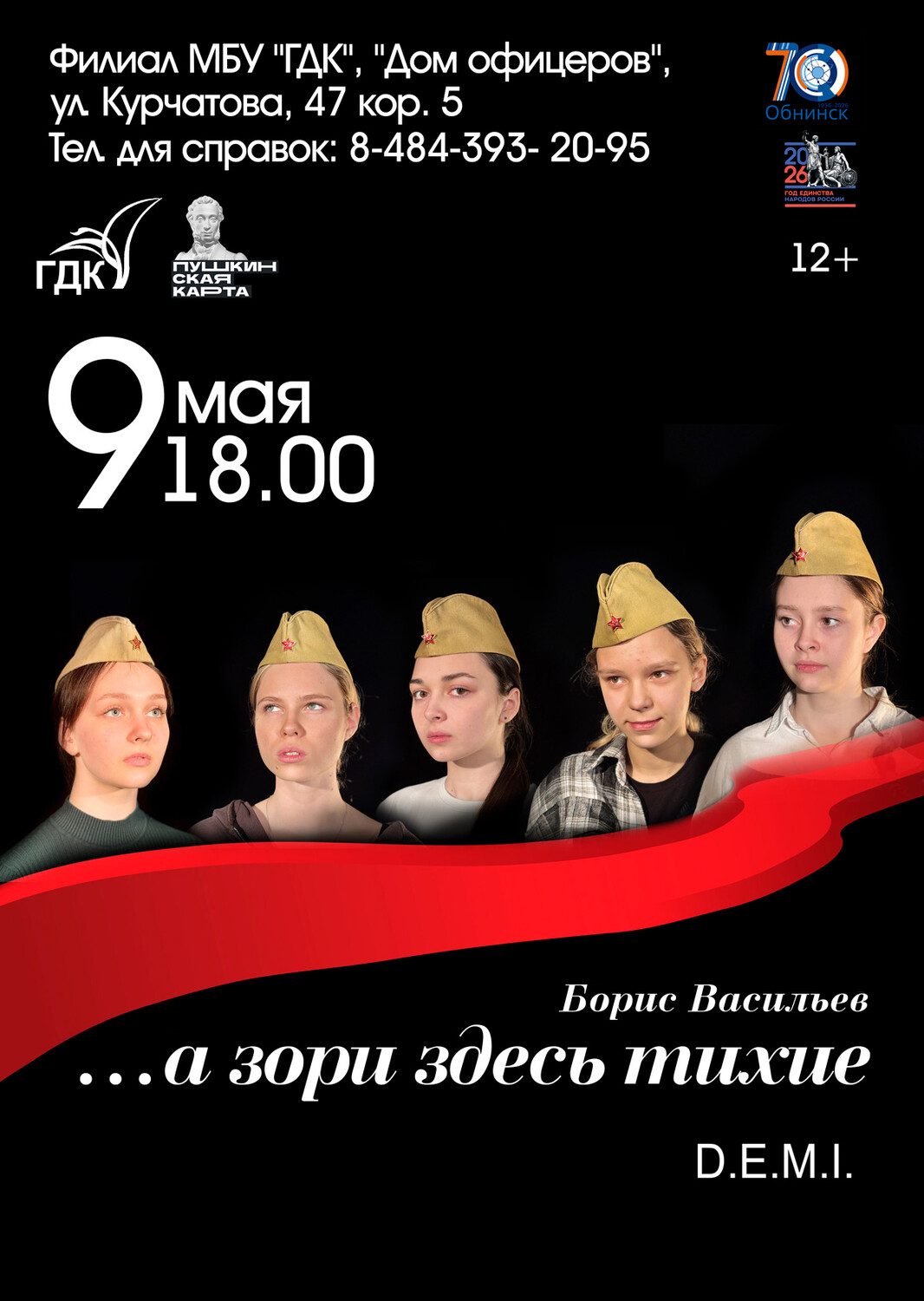 Театр Д.Е.М.И. представляет пронзительный спектакль «…а зори здесь тихие». Это не просто постановка по мотивам бессмертного произведения, а глубокое размышление о цене мира, хрупкости жизни и незыблемой вере в свою страну.
