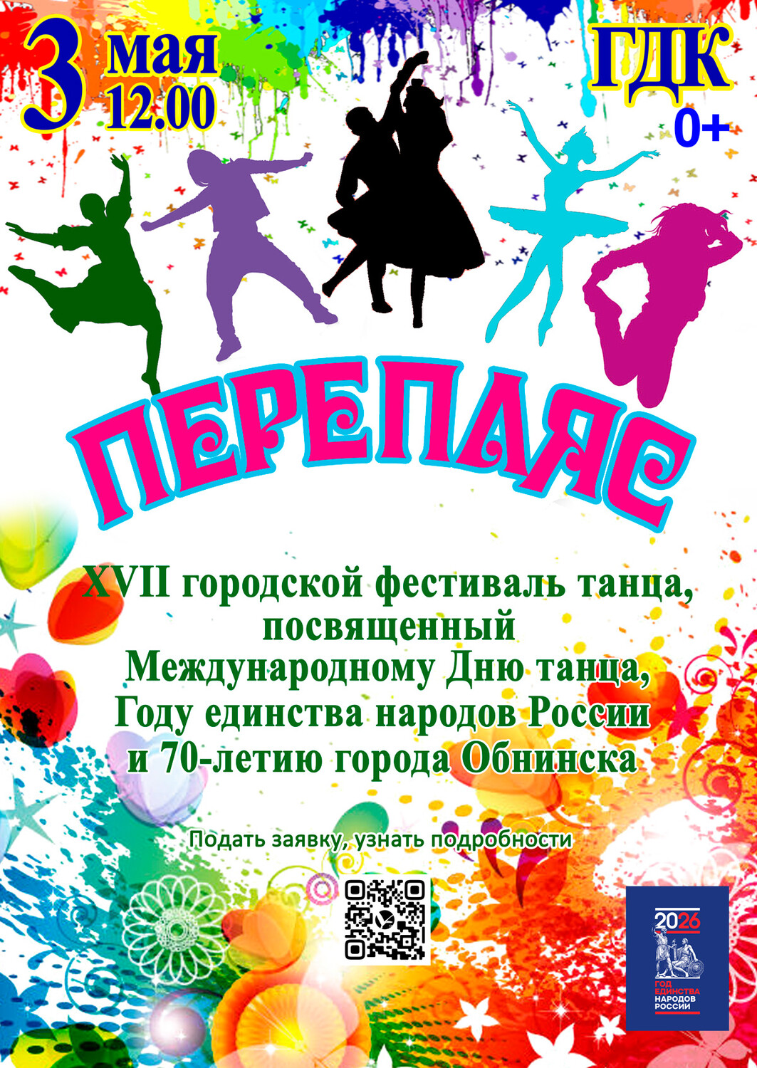 XVII фестиваль танца «Перепляс», посвященный Международному дню танца, Году единства народов России и 70-летию г.Обнинска вновь соберет вместе танцевальный коллективы и солистов наукограда. Принимаем заявки для участия в Фестивале до 17 апреля. Все подробности в Положении.